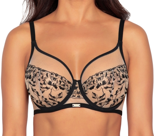 Бюстгальтер 2061 выполнен на основе модели 1396 в телесном цвете с шитыми мягкими чашками на косточках, нижняя часть чашки из сетки с тонкой цветочной вышивкой, незаметно скрывающей то, что должно быть скрыто, продублирована телесной сеткой, верхняя часть чашки из сетки. Окантовка косточек на чашках, резинки и бретели контрастного черного цвета, пояс из эластичного сетчатого полотна. Бретельки регулируются по длине, не отстёгиваются. На спине застёжка на удлинитель, количество крючков в ряду застёжки увеличивается пропорционально размеру бюстгальтера. Фурнитура металлическая цвета желтого золота. Благодаря популярному дизайну грудь получает идеальную поддержку, а идеально скроенные мягкие чашки придают ей естественную округлую форму. Бюстгальтер идеально сочетается с трусиками из коллекции 2060, 2061.