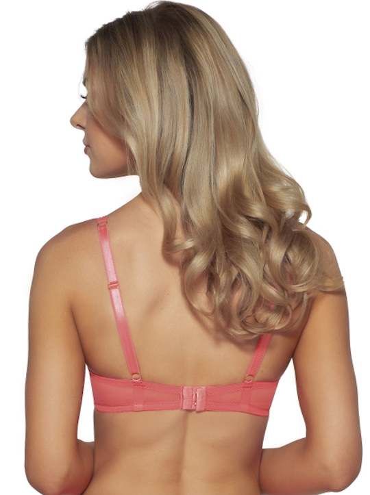 Бюстгальтер 2073 PERLASH выполнен на косточках, чашки шитые из тонкого поролона телесного цвета, со съемными пуш-ап вкладышами, снаружи покрыты кружевом, верхняя часть из телесной сетки, особый шарм придают атласные ленты на косточках, бретельки не отстёгиваются, регулируются по длине. Спинка из плотной сетки цвета коралл. На спине застёжка на удлинитель на 2 крючка. Фурнитура металлическая цвета желтого золота. Бюстгальтер идеально сочетается с трусиками арт. 2073, 2075.