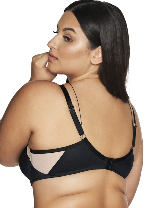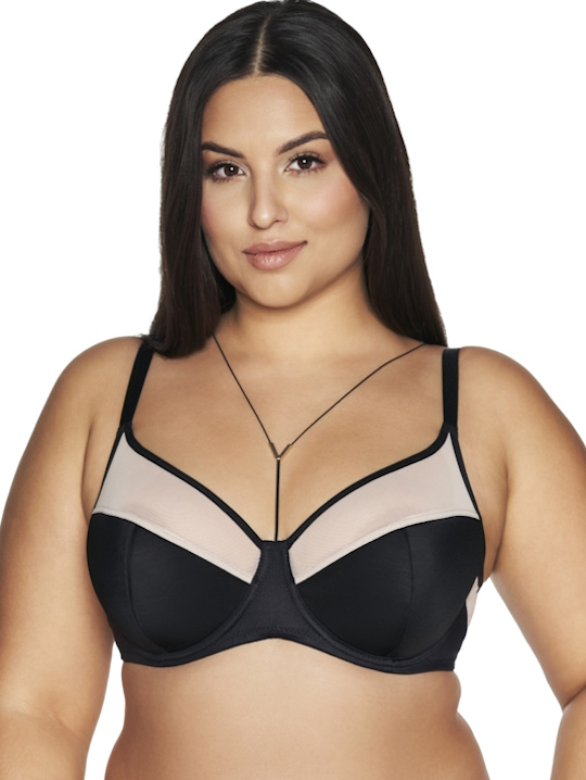 Бюстгальтер 2135 PU Viva выполнен на косточках, чашки шитые, нижняя часть на тонком поролоне, с внутренней стороны проложена хлопковым трикотажем, внешняя сторона гладкая, верхняя часть чашки из телесной сетки. Пояс сшит из плотной стабилизирующей черной сетки с геометрическими вставками телесной сетки по бокам. Бретельки регулируются по длине, не отстёгиваются. На спине застёжка на удлинитель на 2 крючка, фурнитура металлическая цвета желтого золота. В зоне декольте несъемная тонкая эластичная резинка с подвижным металлическим аксессуаром в виде буквы V. Бюстгальтер идеально сочетается с трусиками 2135, 2136.