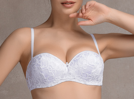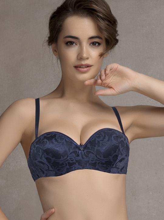 Бюстгальтер-анжелика, "фашия" со средне-градуированной чашкой Navara, с эффектом пуш-ап среднего размера, на косточках. Место крепления бретели к чашке усилено специальной тесьмой, предохраняющей чашку от деформации. Бочок усилен вертикальной гибкой пластиной. Силикон на резинках стана. Отстегивающиеся бретели, возможно ношение без бретелей. Застежка на 2 крючка в три ряда. Выполнен из фактурного кружева.