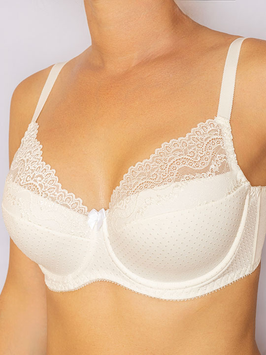 Бюстгальтер "полупоролон" из набивной микрофибры в точку и эластичного кружева. Нижние детали чашек продублированы хлопком. Уникальность данной модели заключается в том, что она соединила в себе 3 конструкции: и бюстгальтер "полупоролон", и бюстгальтер на поролоне и бюстгальтер типа "балконет". На стане бюстгальтера боковые корректирующие пластины, позволяющие прилегать к телу и не скручиваться поясу бюстгальтера, создают необходимую опору и делают силуэт более четким. Украшение: атласный бантик подвеской.