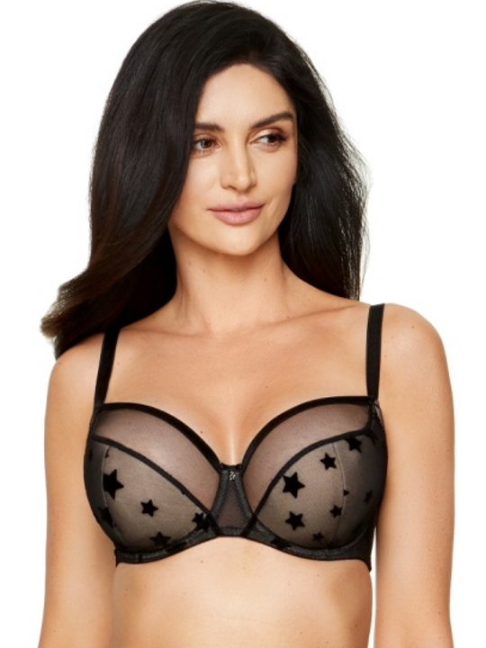 Бюстгальтер Astra B3 PU на косточках, с дополнительными боковыми поддержками, чашки шитые, нижняя часть чашки на тонком поролоне телесного цвета, внутренняя сторона проложена хлопковым трикотажем, внешняя покрыта сеткой с рисунком из флока звезды , верхняя часть чашки из сетки с велюровой резинкой, спинка из сетки со звездами продублирована телесной сеткой. Бретельки не отстёгиваются, регулируются по длине. На спине застёжка на удлинитель. Бюстгальтер идеально сочетается с трусиками Astra.