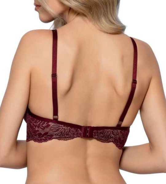Бюстгальтер из коллекции Benita выполнен в модном цвете, на косточках, с дополнительными боковыми поддержками, чашки шитые, на тонком поролоне телесного цвета, со съёмными пуш-ап вкладышами, внутри чашечки проложены хлопковым трикотажем, внешняя сторона покрыта изящным кружевом, верхняя часть чашек из телесной сетки. Бретельки не отстёгиваются, регулируются по длине. На спине застёжка на удлинитель, количество крючков в ряду застёжки увеличивается пропорционально размеру бюстгальтера. Бюстгальтер идеально сочетается с трусиками Benita.