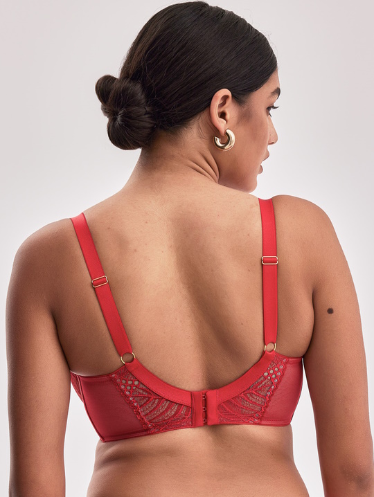 Бюстгальтер Beverly M выполнен на косточках (на каркасах), с дополнительными боковыми поддержками, чашки шитые мягкие, внешняя сторона кружевная, продублированы телесной сеткой, с боковым подкроем. Бретельки не отстёгиваются, регулируются по длине. На спине застёжка на удлинитель, количество крючков в ряду застёжки, увеличивается пропорционально размеру бюстгальтера. Спинка из сетки и кружева продублирована телесной сеткой. В зоне декольте дополнительные тонкие несъемные бретели, регулируются по длине, фурнитура металлическая цвета желтого золота. Бюстгальтер идеально сочетается с трусиками Beverly.