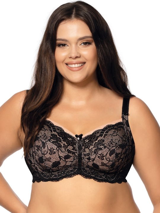 Состав: полиамид 60%, полиэстер 16%, хлопок 10%, эластан 7%, другие 7% Бюстгальтер Carmela M выполнен без косточек, с мягкими шитыми чашками, нижняя часть и боковой подкрой из телесной сетки с имитацией черного кружева, верхняя часть из черного кружева продублирована телесной сеткой, бретельки черный, продублированы тонким поролоном, не отстёгиваются, регулируются по длине. Пояс из черной стабилизирующей сетки, по низу пояса пришита широкая резинка. На спине застёжка на удлинитель, количество крючков в ряду застёжки увеличивается пропорционально размеру бюстгальтера. Фурнитура металлическая крашеная. Бюстгальтер идеально сочетается с трусиками Carmela. Комментарии к товару