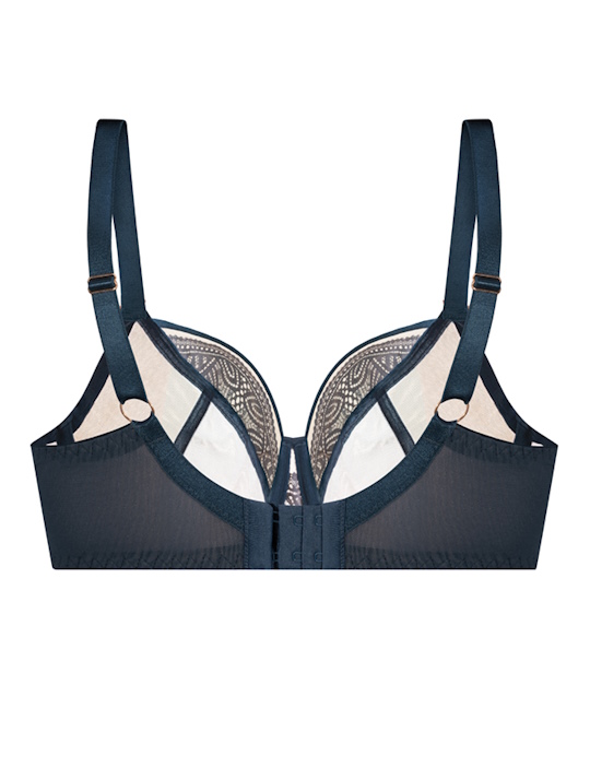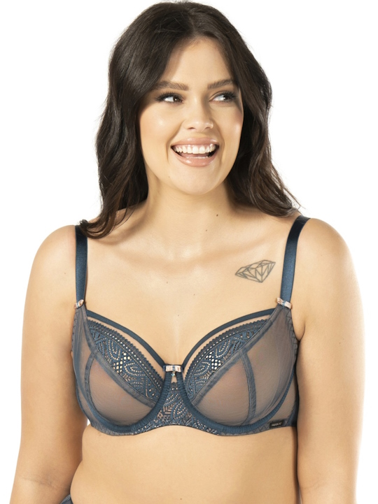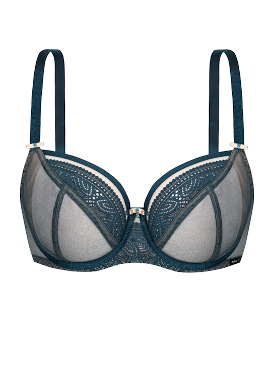 Бюстгальтер Daniela M выполнен на косточках, с дополнительными боковыми поддержками, чашки мягкие, шитые из сетки телесного цвета, покрытой сверху сеткой цвета деним и кружевом, с боковым подкроем. Пояс из сетки цвета деним продублирован телесной сеткой. Бретельки пришиты, регулируются по длине. На спине застёжка на удлинитель, фурнитура цвета меди. Бюстгальтер идеально сочетается с трусиками Daniela.