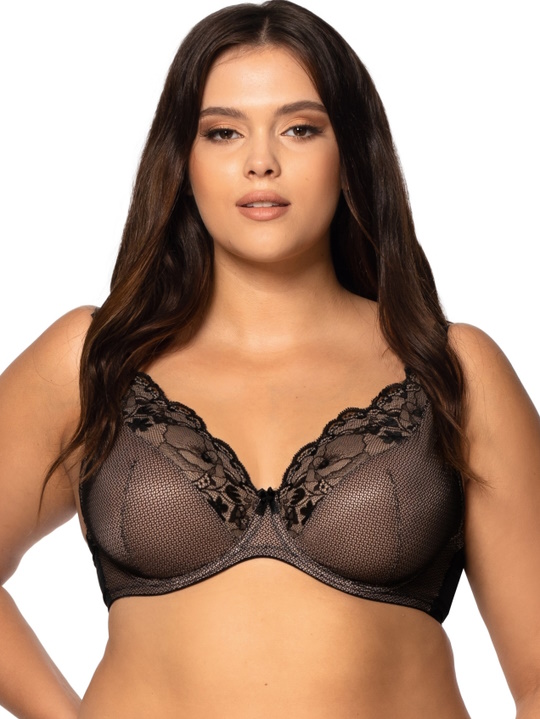 Бюстгальтер-бралетт Estera с мягкими чашечками на косточках, чашки шитые из сетки и кружева, продублированы телесной сеткой, спинка из двух слоев черной микрофибры. Бретельки регулируются по длине, не отстёгиваются. На спине застёжка на удлинитель, количество крючков в ряду застёжки увеличивается пропорционально размеру бюстгальтера. Фурнитура металлическая крашеная.