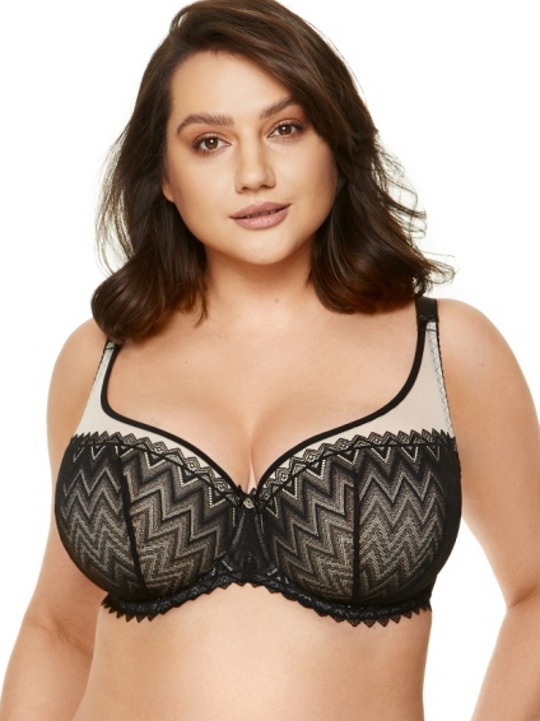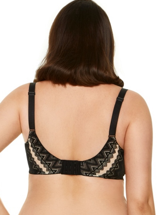 Бюстгальтер Echo B4 U из гипюра с геометрическим рисунком, на косточках, с дополнительными боковыми поддержками, чашки шитые, нижняя часть на тонком поролоне телесного цвета, верхняя часть из сетки телесного цвета, внутренняя сторона проложена хлопковым трикотажем. Бретельки не отстёгиваются, регулируются по длине. На спине застёжка на удлинитель. Бюстгальтер идеально сочетается с трусиками Echo.