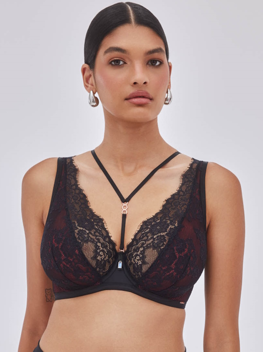 Бюстгальтер бралетт из коллекции Heartbeat M выполнен на основе бюста Marie M Bralette/Glow M Braletteс мягкими чашечками на косточках (на каркасах), с дополнительными боковыми поддержками, чашки шитые из роскошного кружева с цветочным рисунком, продублированы бордовой сеткой. Бретельки регулируются по длине, не отстёгиваются. В зоне декольте дополнительные съемные тонкие бретели, регулируются по длине, крепятся между чашками и на спинке. На спине застёжка на удлинитель, количество крючков в ряду застёжки увеличивается пропорционально размеру бюстгальтера, пояс из сетки продублирован бордовой сеткой. Фурнитура металлическая цвета розового золота. Между чашек украшение в виде красивой подвески с кристаллом цвета сапфира и атласной ленты. Бюстгальтер идеально сочетается с трусиками из коллекции Heartbeat.
