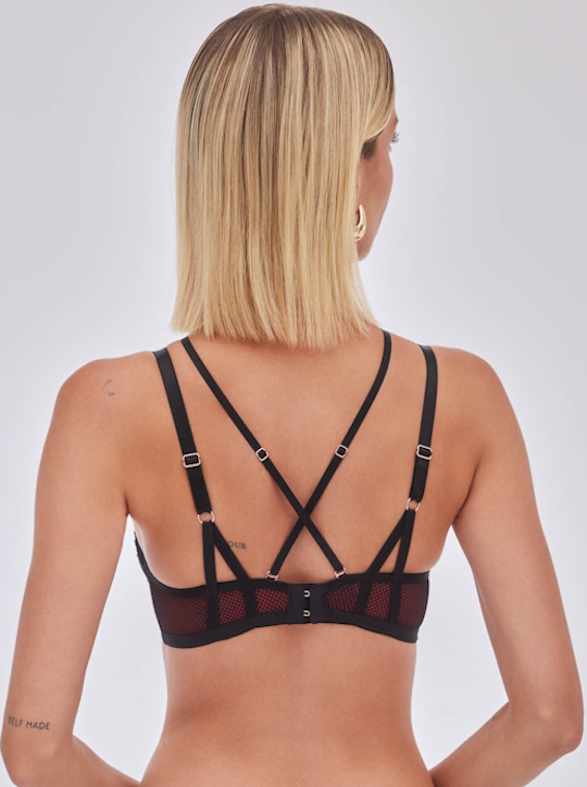 Бюстгальтер из коллекции Heartbeat P-UP выполнен на основе бюста Marie P-UP/Glow P-UP с чашечками на косточках (на каркасах), с дополнительными боковыми поддержками, чашки шитые на тонком поролоне бордового цвета, со съёмными пуш-ап вкладышами, внешняя сторона чашек из роскошного кружева с цветочным рисунком. Бретельки регулируются по длине, не отстёгиваются. В зоне декольте дополнительные съемные тонкие бретели, регулируются по длине, крепятся между чашками и на спинке. На спине застёжка на удлинитель, количество крючков в ряду застёжки увеличивается пропорционально размеру бюстгальтера, пояс из сетки продублирован бордовой сеткой. Фурнитура металлическая цвета розового золота. Между чашек украшение в виде красивой подвески с кристаллом цвета сапфира и атласной ленты. Бюстгальтер идеально сочетается с трусиками из коллекции Heartbeat.