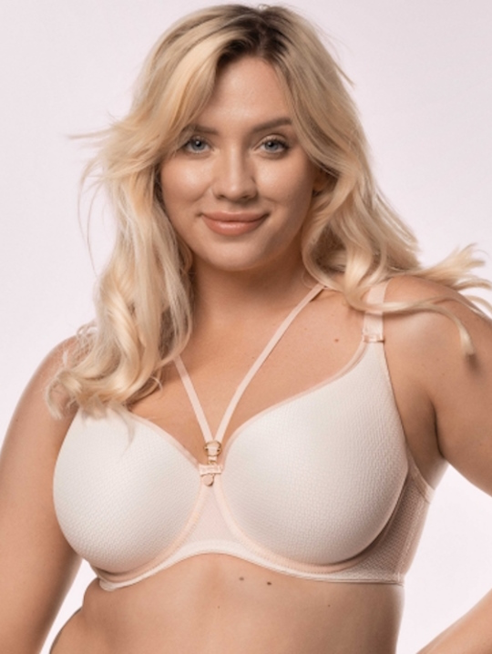 Бюстгальтер Juliana выполнен в цвете Cappuccino из гибридной пены (сочетание чашки спейсер и формованной чашки) цвета экрю, на косточках, внешняя сторона чашек покрыта сеткой цвета капучино, пояс из сетки цвета капучино продублирован микрофиброй цвета экрю. В зоне декольте дополнительные съемные тонкие бретели с подвижным декоративным элементом, регулируются по длине, крепятся между чашками и на спинке. Бретельки пришиты, регулируются по длине. На спинке застёжка на удлинитель, количество крючков в ряду застёжки увеличивается пропорционально размеру бюстгальтера, фурнитура металлическая цвета желтого золота. Бюстгальтер отличчно сочетается с трусами Juliana. Параметры модели бюстгальтер 85E, трусы XL.