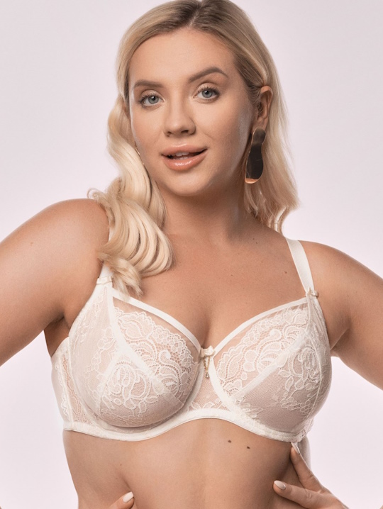 Бюстгальтер Ksenia M выполнен на косточках, с дополнительными боковыми поддержками, чашки мягкие, с боковым подкроем, шитые из кружевного полотна, продублированы сеткой в тон. Пояс из двух слоев сетки. Бретельки пришиты, регулируются по длине. На спине застёжка на удлинитель, фурнитура металлическая цвета желтого золота. Бюстгальтер идеально сочетается с трусиками Ksenia. Параметры модели бюстгальтер 70F, трусы M.