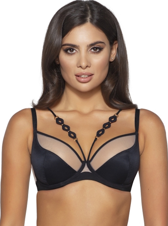 Состав: полиамид 88%, хлопок 8%, эластан 4% Бюстгальтер Leah №03 выполнен на косточках, чашки мягкие шитые неэластичной ткани черного цвета и телесной сетки. Мягкие чашки, изготовленные с особой тщательностью, полностью закрывают грудь, обеспечивая ее естественную форму и стабильную поддержку. Бретельки бюста не отстёгиваются, регулируются по длине, пояс из микрофибры и телесного цвета сетки. На спине застёжка на удлинитель на 2 крючка. В зоне декольте несъемные черные декоративные полосы, идущие вверх по вырезу, обогащенные мягкими декоративными элементами, подсвеченными золотом, сзади переходят в тонкие бретели, дополнительно поддерживают бюст, регулируются по длине. Фурнитура металлическая цвета желтого золота. Бюстгальтер идеально сочетается с трусиками Leah.