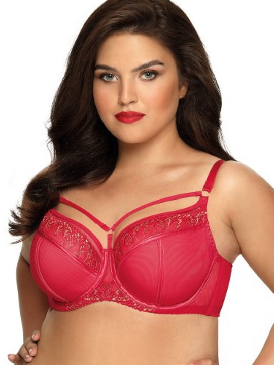 Бюстгальтер Margot №02 PU красного цвета на косточках, с боковыми поддержками, чашки шитые, нижняя часть с тонким поролоном телесного цвета покрыта красной сеткой, внутренняя сторона прошита хлопковым трикотажем, верхняя часть чашки из сетки с вышивкой красной и золотой нитью. Т-образный шов и окантовка косточек декорированы атласной лентой и строчками с золотой нитью. Бретельки не отстёгиваются, регулируются по длине, на спине застёжка - удлинитель на крючках, фурнитура металлическая цвета золота. В зоне декольте тонкие декоративные бретели. Бюстгальтер идеально комплектуется трусиками Margot.