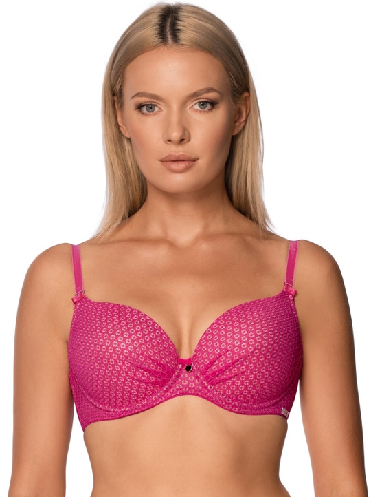 Бюстгальтер из коллекции Matilda push up: чашки формованные телесного цвета, с несъёмным пуш-апом, на косточках, внешняя сторона чашек кружевная. Спинка с ополнительными боковыми поддержками, кружевная, продублирована телесной сеткой. Бретельки отстёгиваются, регулируются по длине. На спине застёжка на удлинитель, количество крючков в ряду застёжки увеличивается пропорционально размеру бюстгальтера. Фурнитура металлическая цвета меди. Бюстгальтер идеально сочетается с трусиками из коллекции Matilda.