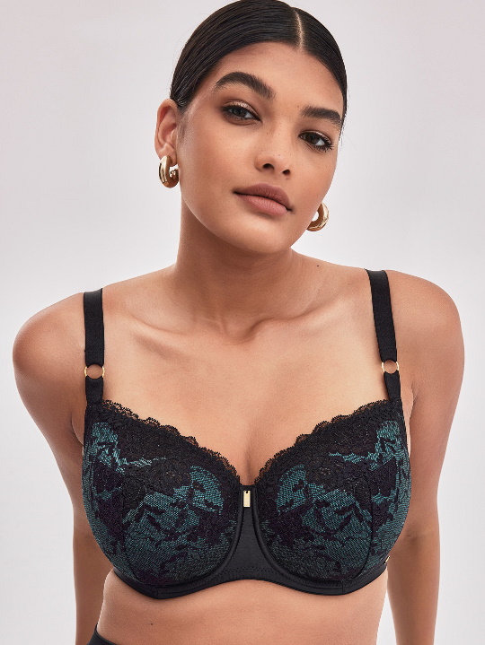 Бюстгальтер из коллекции Moon PU выполнен с чашечками на косточках, с дополнительными боковыми поддержками, чашки шитые, нижняя часть из тонкого поролона, снаружи и верхняя часть чашек из чено-зеленого кружева. Спинка из двух слоев черной сетки. Бретельки регулируются по длине, не отстёгиваются. На спине застёжка на удлинитель, количество крючков в ряду застёжки увеличивается пропорционально размеру бюстгальтера. Фурнитура металлическая цвета желтого золота. Бюстгальтер идеально сочетается с трусиками из коллекции Moon.