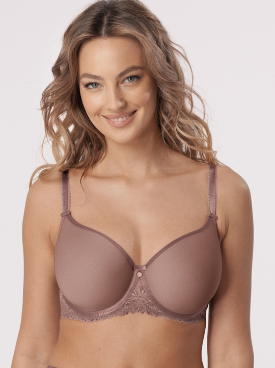 Бюстгальтер Rebecca выполнен в цвете Mocca с формованными поролоновыми чашками типа spacer, на косточках, с боковым подкроем, внешняя сторона чашек гладкая, пояс из кружева продублирован сеткой в тон. Бретельки пришиты, регулируются по длине. На спинке застёжка на удлинитель, фурнитура металлическая цвета желтого золота. Бюстгальтер отлично сочетается с трусами Rebecca. Параметры модели бюстгальтер 70F, трусы M.