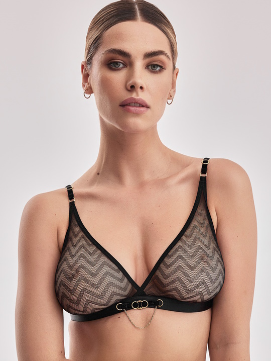 Бюстгальтер из коллекции Sono выполнен из сетки с геометрическим рисунком, чашки-треугольник мягкие, бретели регулируются по длине, под бюстом широкая резинка, регулируется по длине, на спине с застежка. Фурнитура металлическая цвета золота. Резинка под бюстом декорирована бархатными резинками с металлическими золотыми элементами и тонкой цепочкой.
