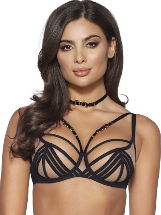 Состав: полиамид 88%, хлопок 8%, эластан 4% Бюстгальтер Uma №03 выполнен на косточках, чашки шитые из сетки телесного цвета, с внешней стороны декорированы тонкими черными резинками. Бретельки бюста не отстёгиваются, регулируются по длине, в зоне декольте декоративная несъемная сбруя из тонких бархатных союзок с металлическими кольцами цвета желтого золота. Пояс из плотной стабилизирующей сетки с черными резинками. На спине застёжка на удлинитель на 2 крючка. Бюстгальтер идеально сочетается с трусиками Uma.