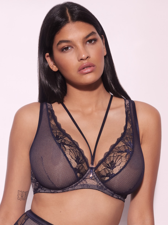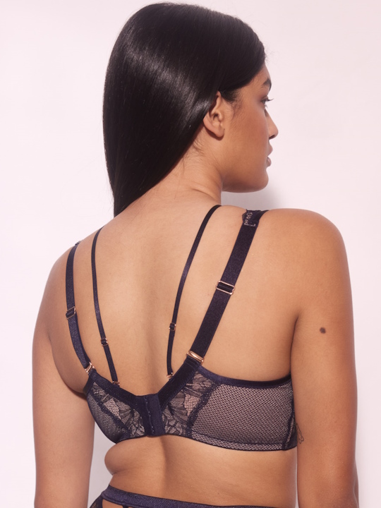 Бюстгальтер бралетт из коллекции Volare M в темно-синем цвете с мягкими чашечками на косточках, с дополнительными боковыми поддержками, чашки шитые, богато декорированы нежным цветочным кружевом, продублированы телесной сеткой, пояс из эластичного сетчатого кружевного полотна на контрастной подкладке из стабилизирующей сеточки. Широкие бретели с подкладкой из мягкого пеноматериала регулируются по длине, не отстёгиваются. В зоне декольте дополнительные съемные тонкие бретели, регулируются по длине, крепятся между чашками и на спинке. Фурнитура металлическая цвета меди. Бюстгальтер идеально сочетается с трусиками из коллекции Volare.