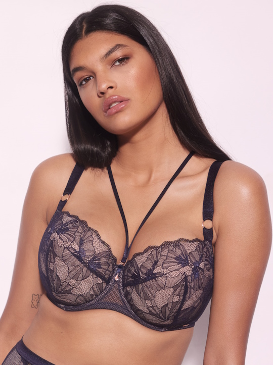 Бюстгальтер Volare U/W выполнен в темно-синем цвете на косточках, чашки шитые на тонком поролоне телесного цвета, со съёмными пуш-ап вкладышами, внешняя сторона богато декорирована нежным цветочным кружевом. Пояс из эластичного сетчатого кружевного полотна на контрастной подкладке из стабилизирующей сеточки телесного цвета. Бретельки не отстёгиваются, регулируются по длине. На спине застёжка на удлинитель, количество крючков в ряду застёжки, увеличивается пропорционально размеру бюстгальтера, фурнитура металлическая цвета меди. В зоне декольте дополнительные съемные тонкие бретели, регулируются по длине, крепятся между чашками и на спинке, Бюстгальтер идеально сочетается с трусиками Volare.
