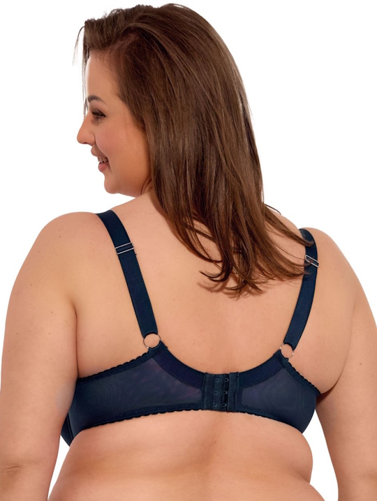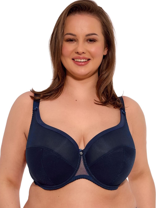 Бюстгальтер 1058 Sonia PU выполнен в цвете деним на косточках, чашки шитые, удлиненные до бретельки, нижняя часть на тонком поролоне, внутренняя сторона прошита хлопковым трикотажем, внешняя и верхняя часть чашки из тонкого полосатого трикотажа, спинка из стабилизирующей сетки. Приподнятый срез нижней чашки закрывает сосок, середина бюстгальтера средней высоты, плотно прилегает к грудине, эластичный трикотаж и широкая резинка плотно собирают грудь и придают ей круглую форму. Бретельки не отстёгиваются, регулируются по длине, на спине застёжка - удлинитель на крючках, фурнитура металлическая крашеная. Отлично сочетается с трусами 1058 Sonia.