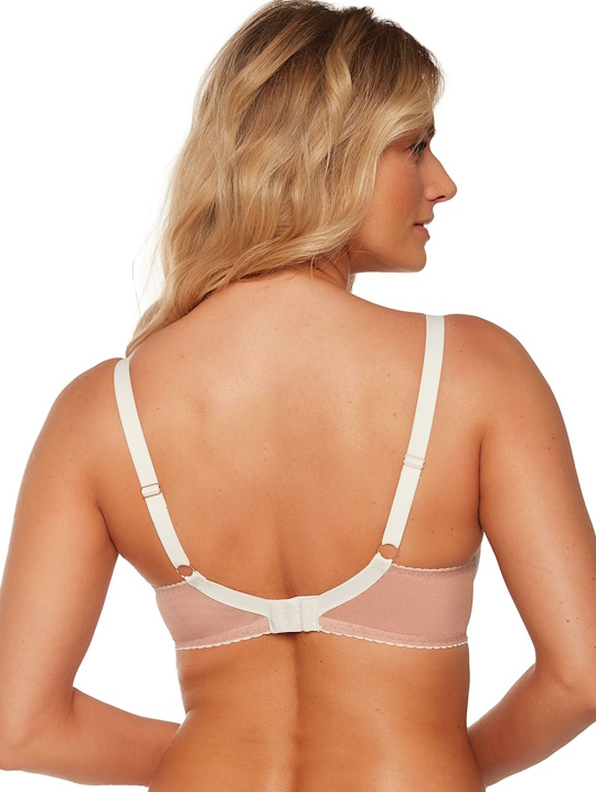 Бюстгальтер 1242 выполнен на косточках, чашки шитые, нижняя часть на тонком поролоне цвета мокка, внутренняя сторона прошита хлопковым трикотажем, верхняя часть чашек из телесной сетки, внешняя сторона чашек из кружевного полотна, спинка из стабилизирующей сетки цвета мокка. Бретельки не отстгиваются, регулируются по длине, на спине застжка - удлинитель на крючках, фурнитура металлическая цвета меди. Бюст сочетается с трусами 1243 , 1242 .
