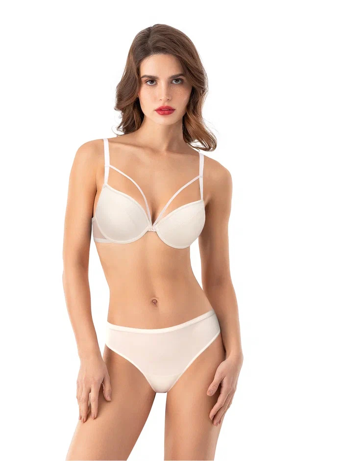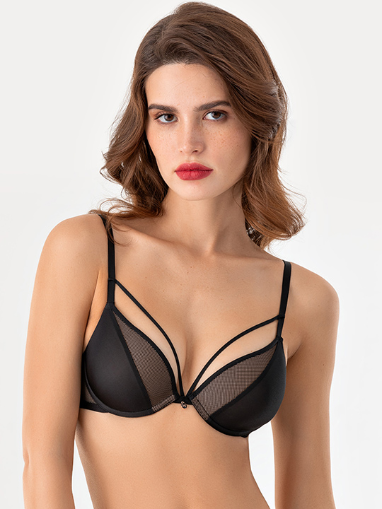 Бюстгальтер пуш-ап среднего размера с гелевой чашкой Matera, на косточках. Регулируемые бретели и стрепы. Застежка в два ряда на три позиции. Выполнен из прозрачной крупной сетки и микрофибры, обработаны плоскими резинками на крыльях, пришитыми поверх основных материалов. Коллекция "Ornella".