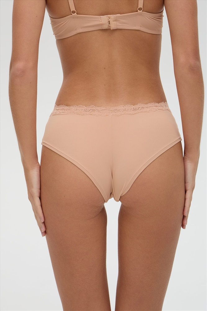 Бюстгальтер с формованными чашками balconette с небольшим push-up во всех размерах, на каркасах и с боковыми корсетными вставками, выполнен из нежного полотна в рубчик. Элегантное кружево по верхнему срезу чашек, бантик и подвеска с наименованием бренда украшают изделие. Регулируемые бретели не отстегиваются. Застежка на 2 крючка и 3 ряда петель.