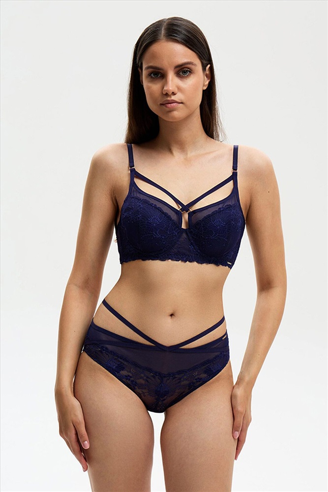 Бюстгальтер с формованными чашками balconette с push-up во всех размерах, на каркасах и с боковыми корсетными вставками выполнен из нежного кружева и сетки глубокого синего цвета. Переднюю часть лифа украшают стрепы, переходящие в регулируемые бретели. Застежка на 2 крючка и 3 ряда петель. Дополнительные украшения - брендированный шильдик и кольца на стрепах. Ширина бретелей на объемы 70, 75 и 80 см с чашками А,В,С - 10мм, на объемы 75, 80 и 85 с чашками D и E и размер 85С - 12 мм. Размерная сетка 70B, 70C, 75A, 75B, 75C, 75D, 75E, 80B, 80C, 80D, 80E, 85B, 85C, 85D, 85E.