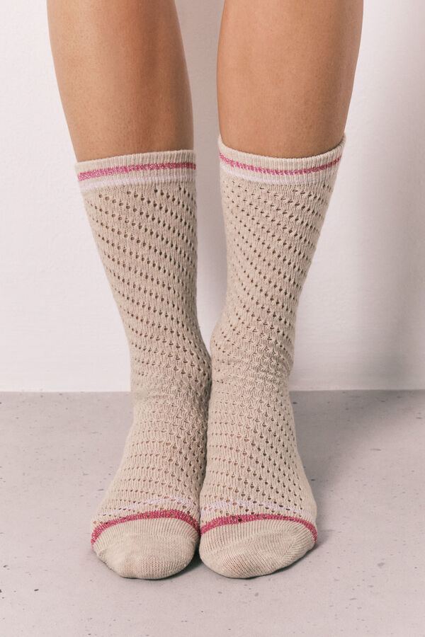 Calcetines largos con textura y rayas de lurex, fabricados en algodón suave y elástico. Diseñado para ofrecer comodidad y estilo durante tus actividades diarias.