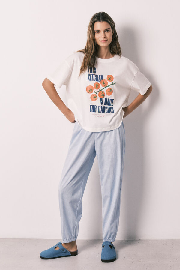 Camiseta de manga corta confeccionada en tejido 100% algodón, suave y transpirable. Presenta cuello redondo y estampado frontal de inspiración gráfica con texto. Ideal para combinar con pantalones de la colección y disfrutar de máxima comodidad en casa. Esta prenda pertenece a una colaboración especial de Chloé Sucré x Women´Secret.