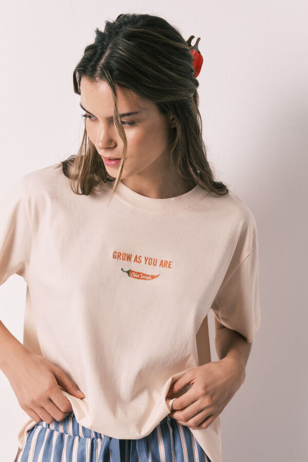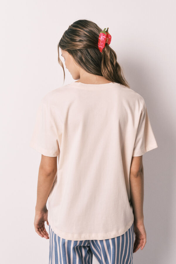 Camiseta de manga corta confeccionada en tejido 100% algodón, suave y transpirable. Presenta cuello redondo y con texto bordado en el pecho. Ideal para combinar con pantalones de la colección y disfrutar de máxima comodidad en casa. Esta prenda pertenece a una colaboración especial de Chloé Sucré x Women´Secret.