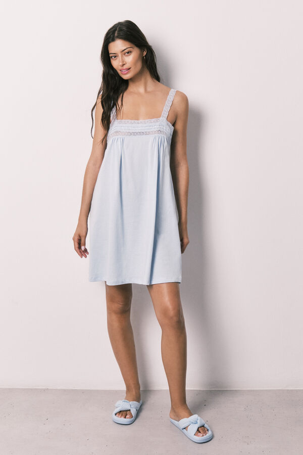 Camisón corto 100% algodón, con tirantes de encaje y pliegues en el pecho. Súper fresquito, ideal para dormir o estar en casa con estilo.