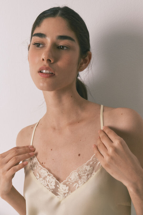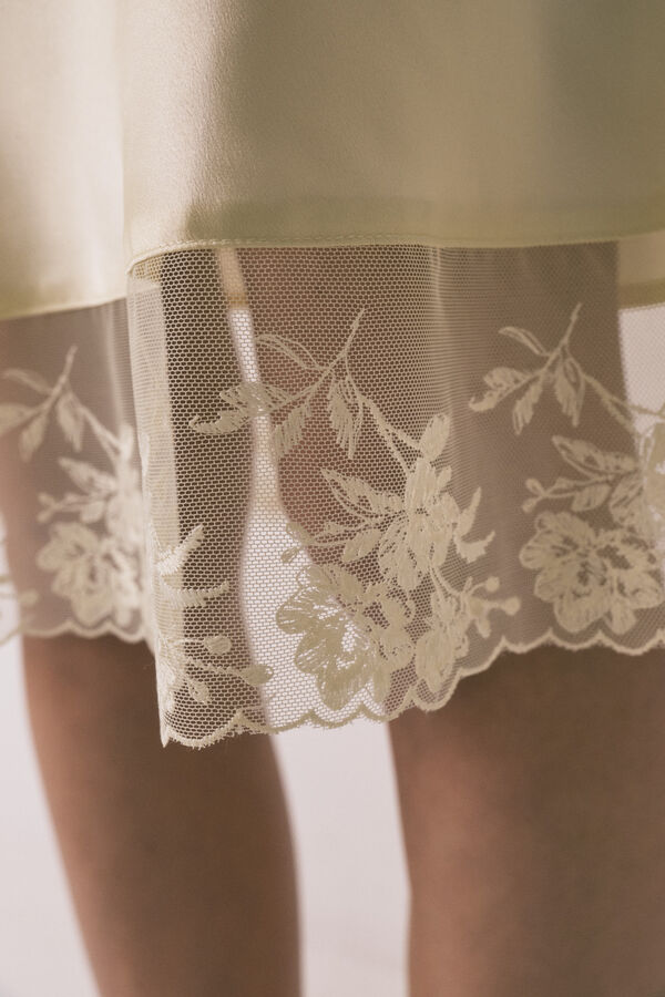 Camisón corto en tejido de satén, con detalles de pieza de encaje bordado en el escote y y en el bajo. Ideal para dormir o estar en casa cómoda y con estilo.