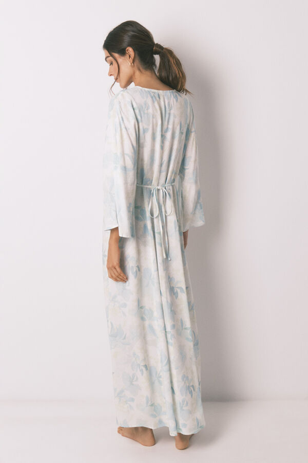 Camisón largo 100% viscosa con estampado all over, escote en pico, cruzado y cinturón estampado a tono en la cintura. Ideal para dormir o estar en casa sin perder tu toque personal de estilo.