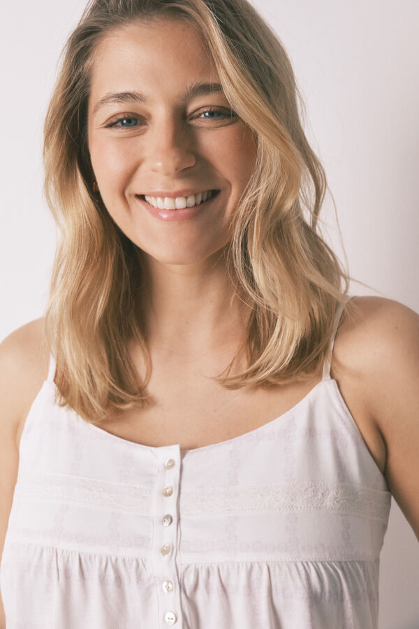 Camisón midi de colección maternity, confeccionado con algodón y modal con estampado de cuadros. De tirante finos regulables y con escote redondo abotonado apto para la lactancia. Detalle de volante en el bajo. Al elegir nuestros productos de algodón, estás apoyando nuestra inversión en la iniciativa Better Cotton.