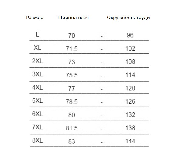 Размер: L, XL, 2XL, 3XL, 4XL, 5XL, 6XL, 7XL, 8XL
