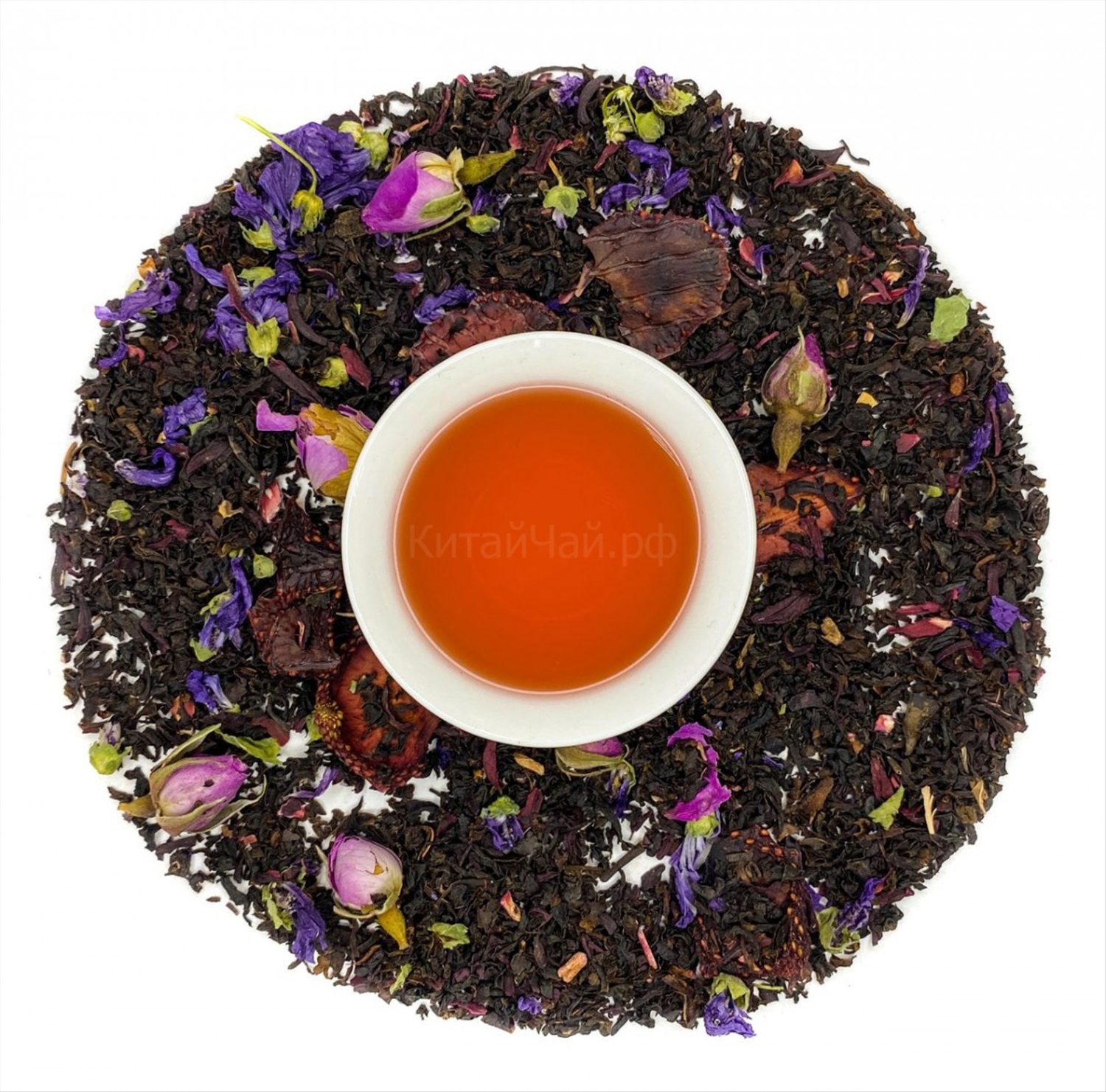Чай черный, гибискус, кусочки клубники, роза, василек, цветочно-ягодный аромат. Ароматизирован натуральными маслами.