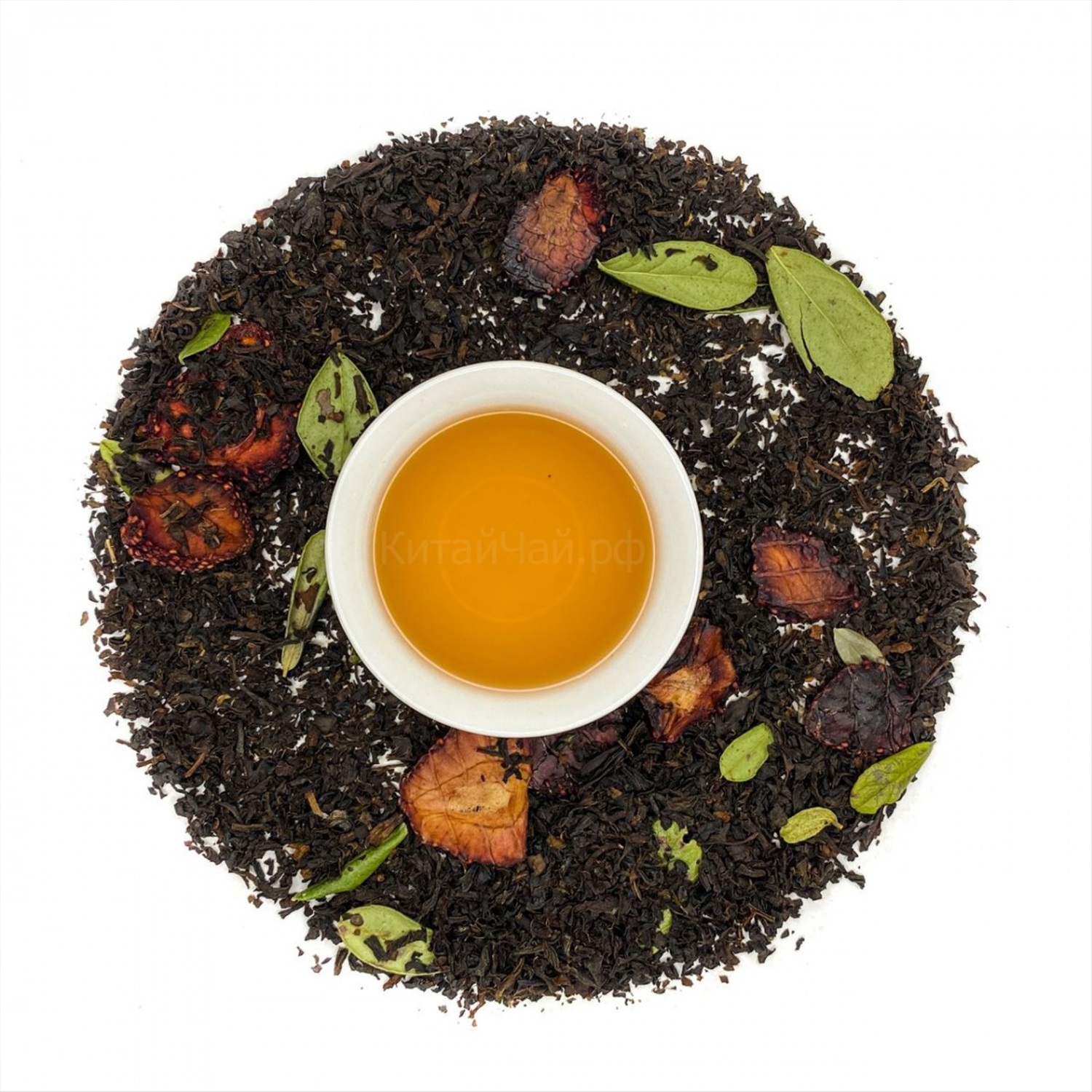 Чай черный, кусочки и листья клубники. Ароматизирован натуральными маслами.