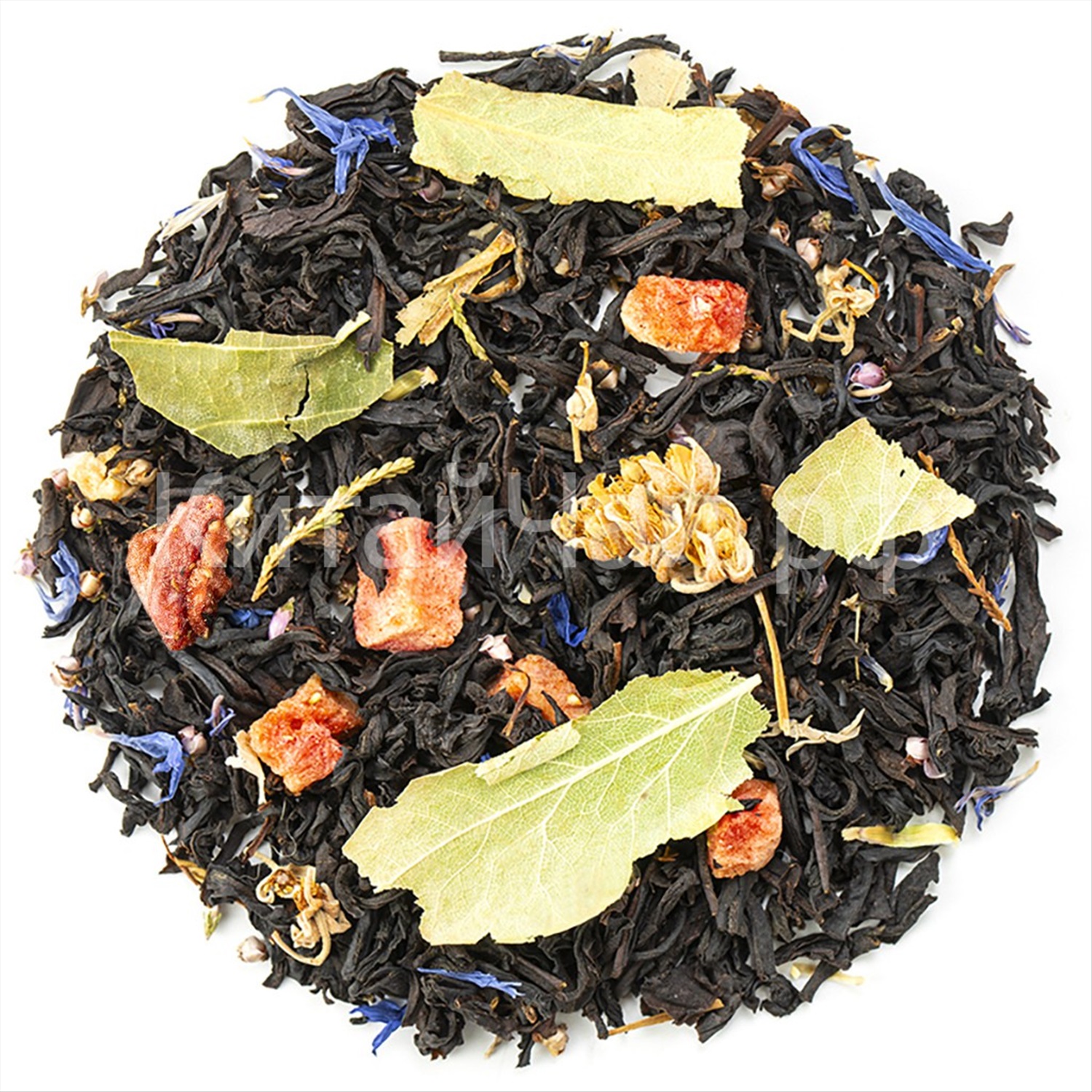 Черный индийский чай, цветы вереска, листы липы, кусочки клубники, василек, аромат меда и клубники.