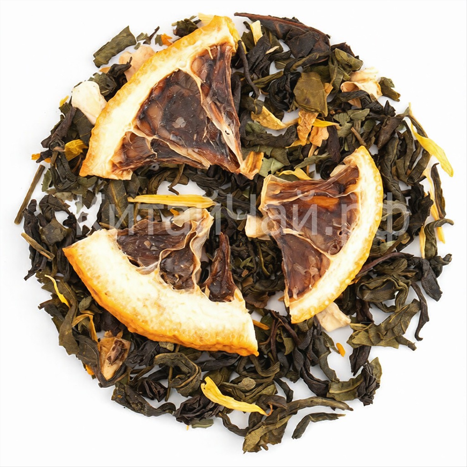Зеленый чай, черный чай, цедра лимона, сегменты лимона, мята, лепестки календулы, аромат мёда и цитруса.