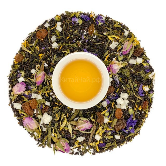 Купаж черного чая и зеленого чая сенча, изюм, кубики ананаса, роза, календула, василек. Ароматизирован натуральными маслами.