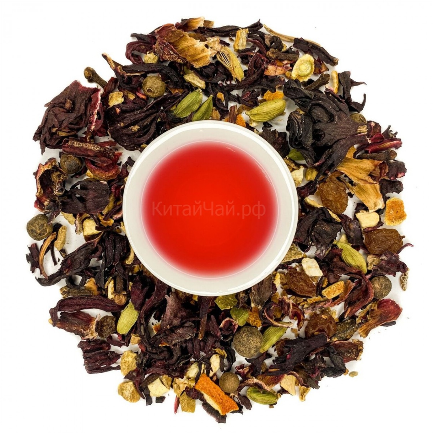 Гибискус, изюм, имбирь, корица, кардамон, гвоздика, душистый перец, мускатный орех, кусочки апельсина. Ароматизирован натуральными маслами.