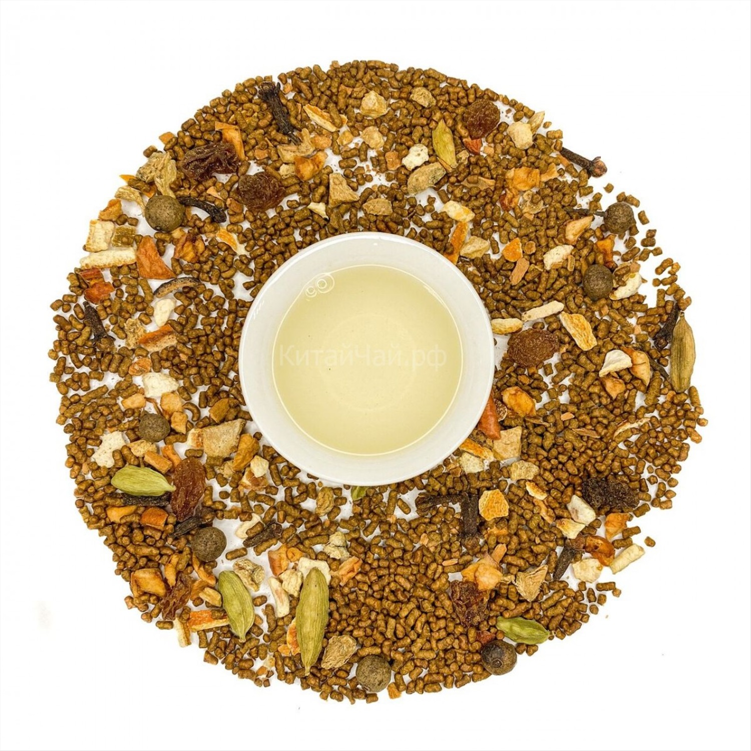 Гречишный чай, изюм, имбирь, корица, кардамон, гвоздика, душистый перец, мускатный орех, кусочки апельсина и яблока.