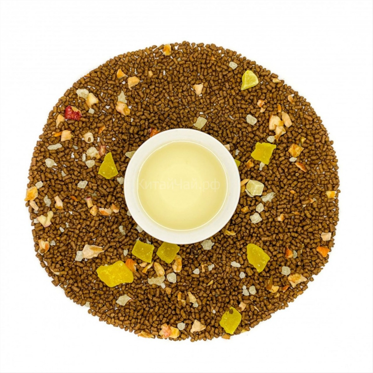 Гречишный чай, цукаты дыни и ананаса, кусочки сушеного яблока, аромат манго. Ароматизирован натуральными маслами.