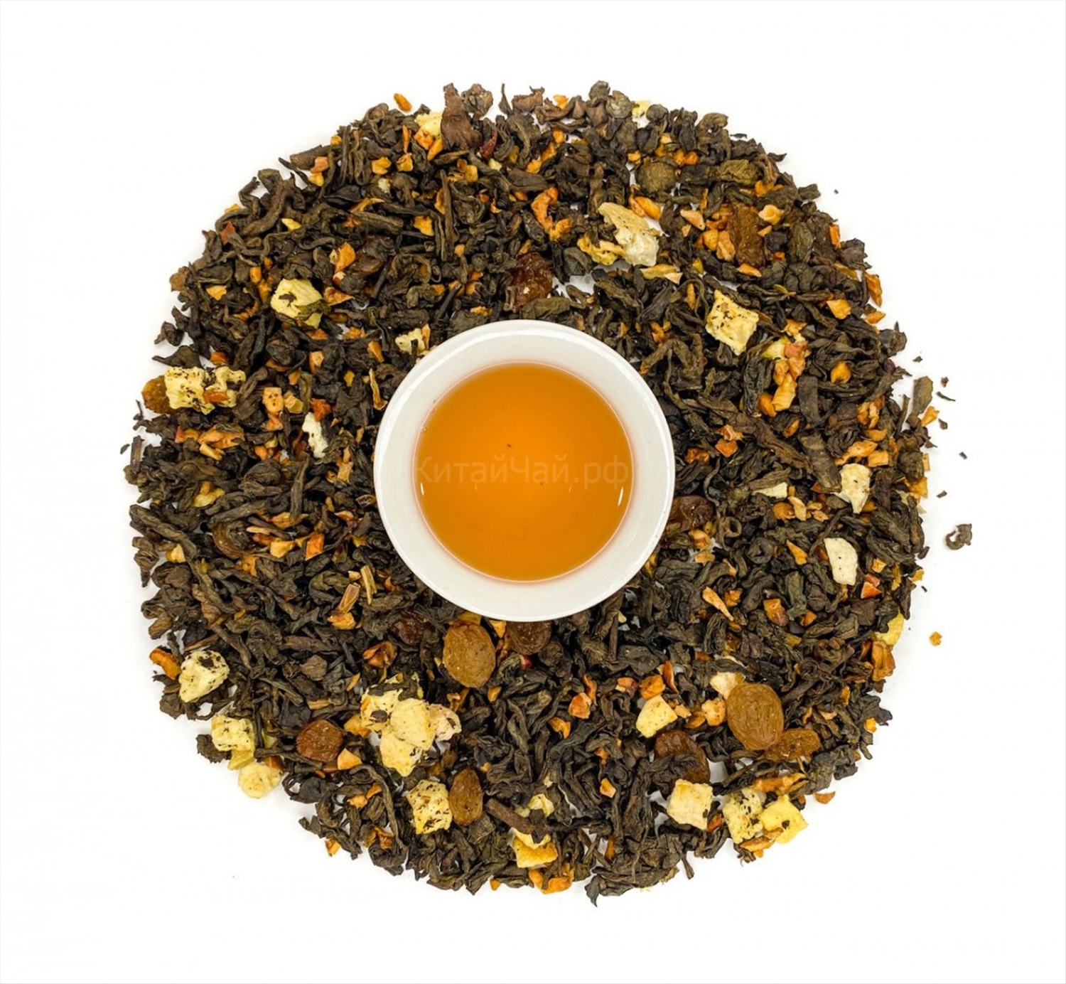 Пуэр крупнолистовой шу, изюм, кусочки яблока, кусочки персика, аромата ямайского рома.