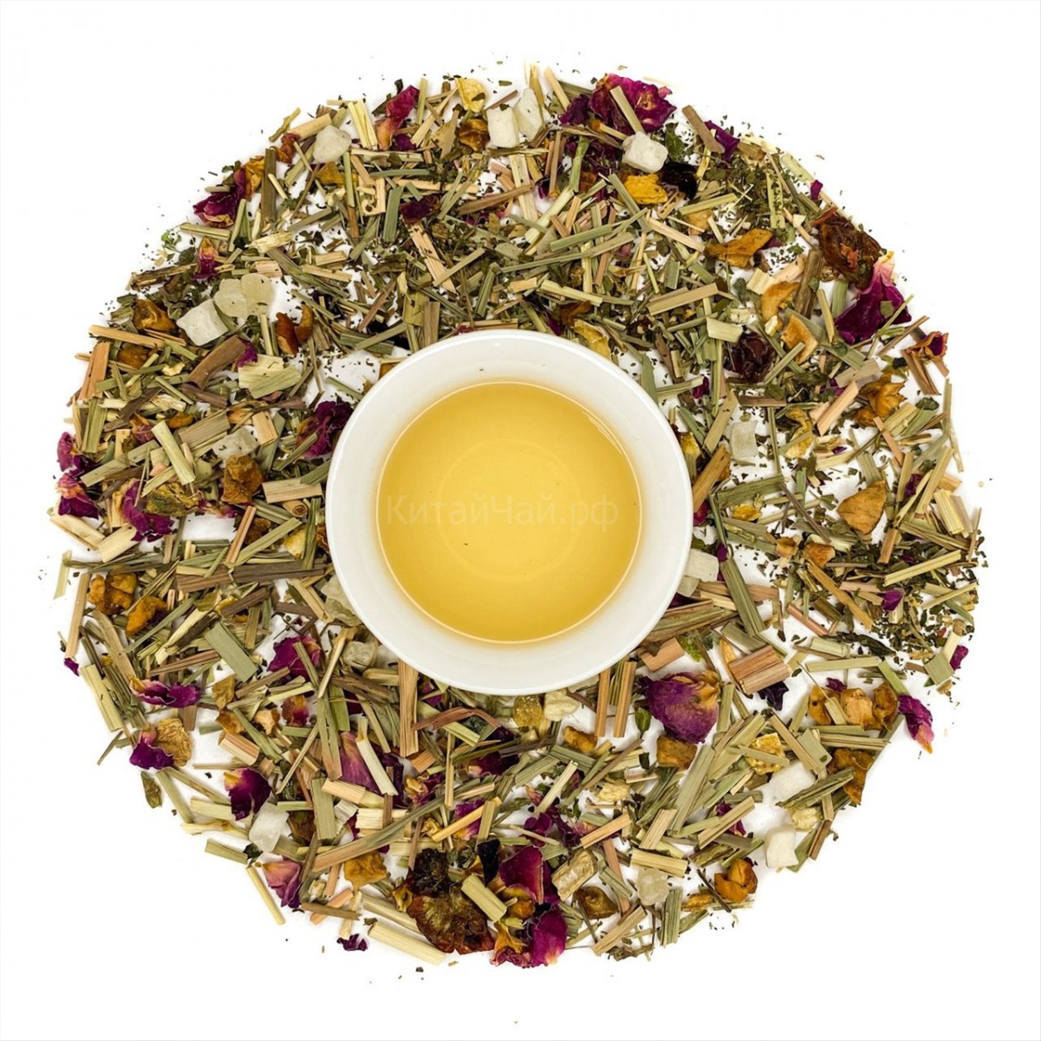 Мята, лимонная трава, имбирь, яблоко, кусочки ананаса, цедра лимона, шиповник, роза. Без ароматизаторов.