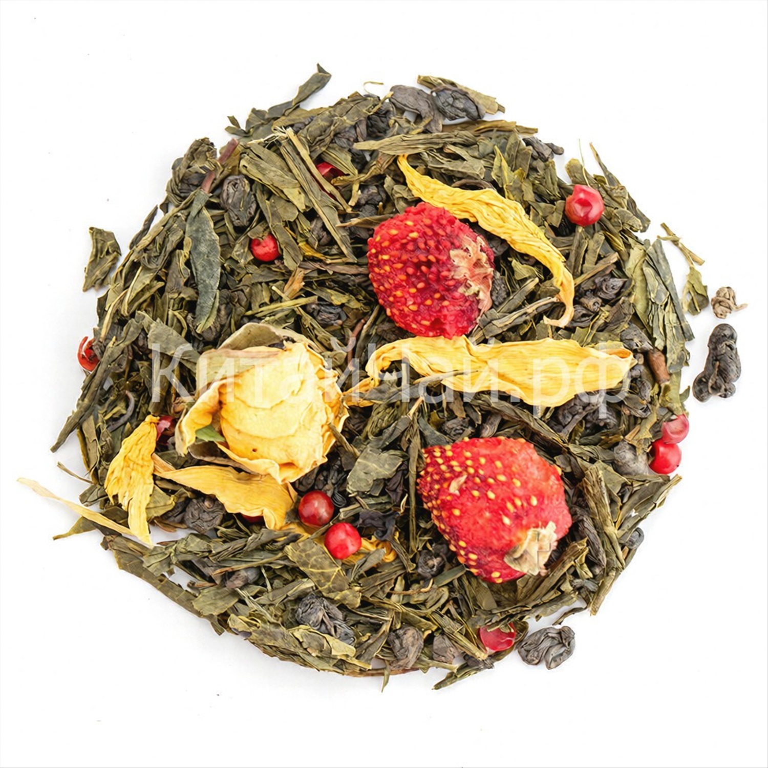 Зеленый чай, ягоды клубники, бутоны роз, розовый перец, лепестки подсолнуха, аромат садовых ягод.