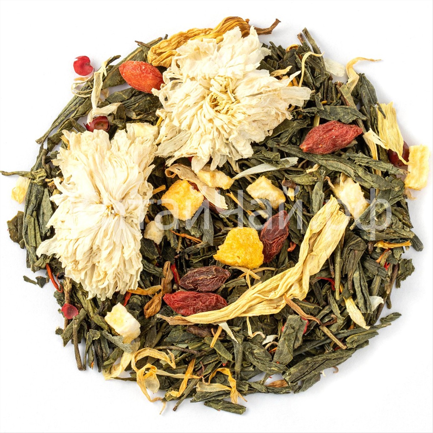 Сенча, ягоды годжи, кусочки персика, хризантема, лепестки подсолнуха, перец розовый горошек, аромат ванили и лайма.